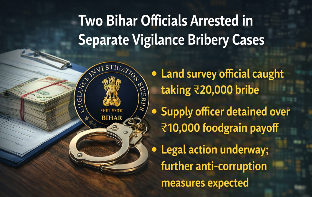 Bihar’s Vigilance Investigation Bureau arrested two government officials in separate bribery cases following trap operations. A survey amin was allegedly caught taking ₹20,000 for clearing land survey work, while a block supply officer was detained for accepting ₹10,000 linked to foodgrain allocation. Authorities said legal procedures are underway, with further anti-corruption actions expected across departments.