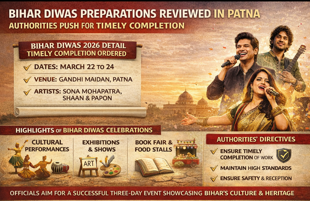 Preparations for the upcoming Bihar Diwas 2026 celebrations are in full swing in Patna, with officials intensifying efforts to ensure smooth execution of the three-day event at Gandhi Maidan. Senior authorities recently reviewed the arrangements and directed all departments to complete pending work within the stipulated timeline while maintaining high standards.