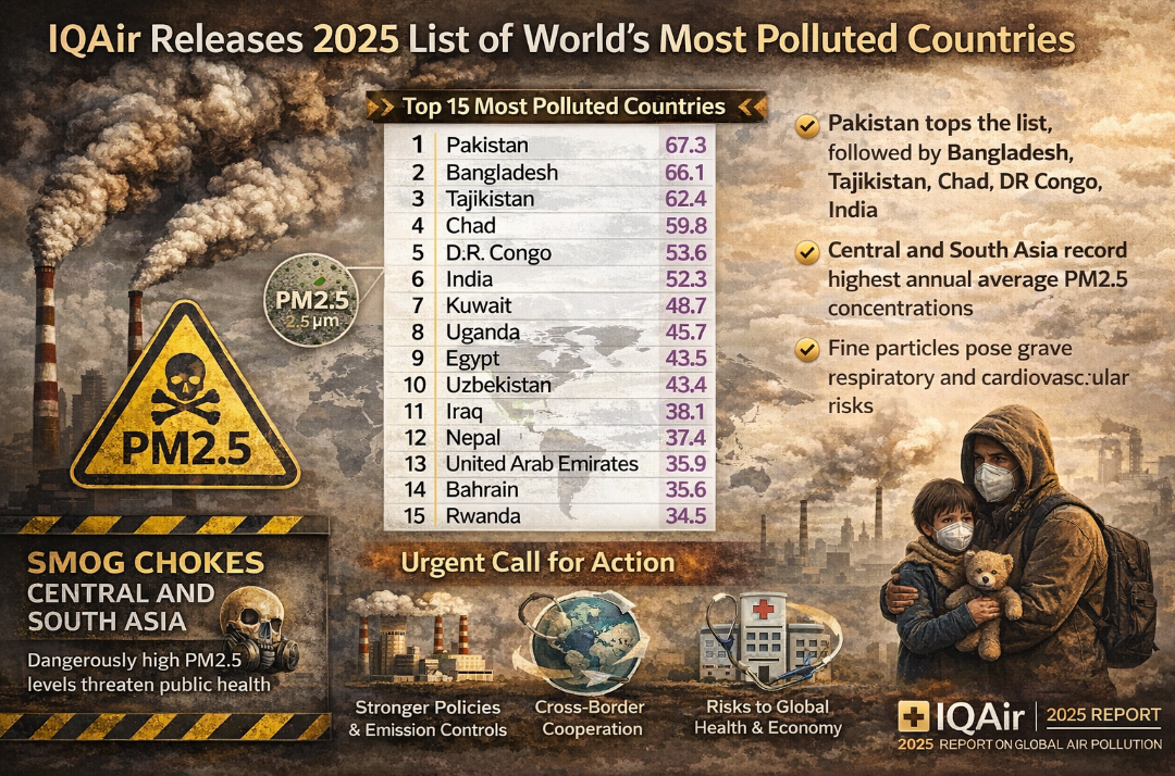 Global air quality monitor IQAir has released its 2025 report on the world’s most polluted countries, with Pakistan ranking at the top. Bangladesh and Tajikistan follow closely, while Chad, the Democratic Republic of Congo, and India also feature among the most polluted nations. Other countries in the top 10 include Kuwait, Uganda, Egypt, and Uzbekistan.